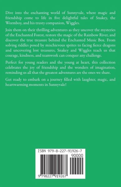 Dive into the enchanting world of Sunnyvale, where magic and friendship come to life in five delightful tales of Snakey, the Wormboy, and his trusty companion, Wiggles. Join them on their thrilling adventures as they uncover the mysteries of the Enchanted Forest, restore the magic of the Rainbow River, and discover the true treasure behind the Enchanted Music Box. From solving riddles posed by mischievous sprites to facing fierce dragons and uncovering lost treasures, Snakey and Wiggles teach us that courage, kindness, and teamwork can conquer any challenge. Perfect for young readers and the young at heart, this collection celebrates the joy of friendship and the wonders of imagination, reminding us all that the greatest adventures are the ones we share. Get ready to embark on a journey filled with laughter, magic, and heartwarming moments in Sunnyvale!
