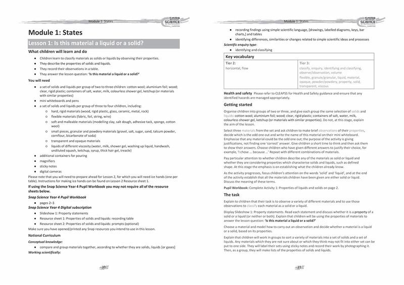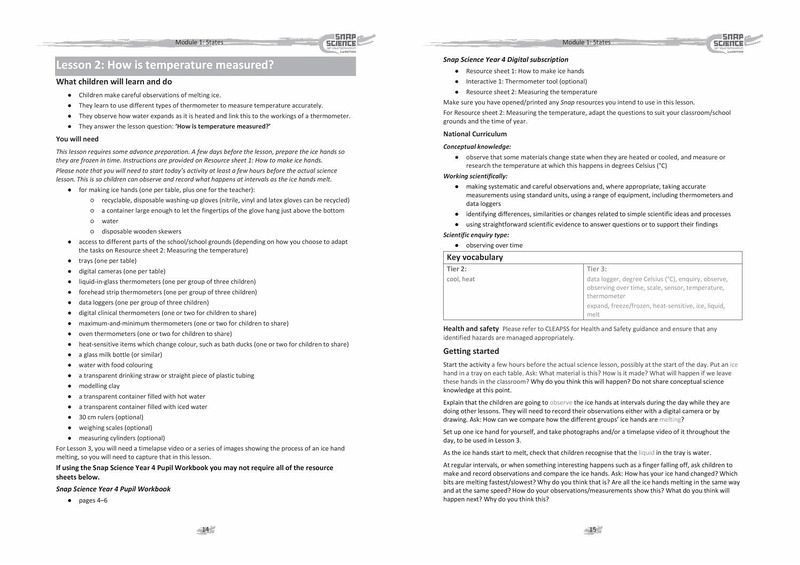 Snap Science is a dynamic toolkit for teaching Primary Science. It provides support for planning, teaching and tracking progression. This Teacherâ s Guide provides a printed copies of all the lesson plans for the year group in the 2nd Edition course.