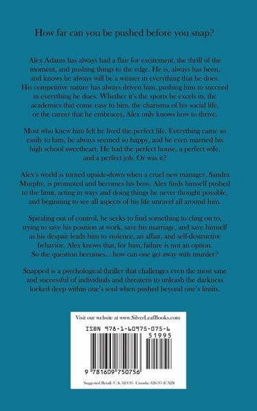 Alex Adams has always had a flair for excitement, the thrill of the moment, and pushing things to the edge. He is, always has been, and knows he always will be, a winner in everything that he does. His competitive nature has always driven him, pushing him to succeed in everything he does. Whether it's the sports he excels in, the academics that come easy to him, the charisma of his social life, or the career that he embraces, Alex only knows how to thrive. Most who knew him felt he lived the perfect life. Everything came so easily to him, he always seemed so happy, and he even married his high school sweetheart. He had the perfect house, a perfect wife, and a perfect job. Or was it? Alex's world it turned upside-down when a cruel new manager, Maria Thompson, is promoted and becomes his boss. Alex finds himself pushed to the limit, acting in ways and doing things he never thought possible, and beginning to see all aspects of his life unravel all around him. Spiraling out of control, he seeks to find something to cling on to, trying to save his position at work, save his marriage, and save himself as his despair leads him to violence, an affair, and self destructive behavior. Alex knows that, for him, failure is not an option. So, the question becomes... how can one get away with murder? Snapped is a psychological thriller that challenges even the most sane and successful of individuals and threatens to unleash the darkness locked deep within one's soul when pushed beyond one's limits.