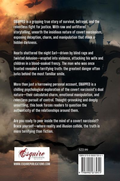 SNAPPED is a gripping true story of survival, betrayal, and the relentless fight for justice. With raw and unfiltered storytelling, unearth the insidious nature of covert narcissism, exposing deception, charm, and manipulation that mask a hidden darkness. Hearts shattered the night Earl-driven by blind rage and twisted delusion-erupted into violence, attacking his wife and children in a blood-soaked frenzy. The man who was once trusted revealed a terrifying truth: the greatest danger often lurks behind the most familiar smile. More than just a harrowing personal account, SNAPPED is a chilling psychological exploration of the covert narcissist's dual nature-their calculated charm, emotional manipulation, and relentless pursuit of control. Thought-provoking and deeply unsettling, this book forces readers to question the authenticity of the relationships around them.