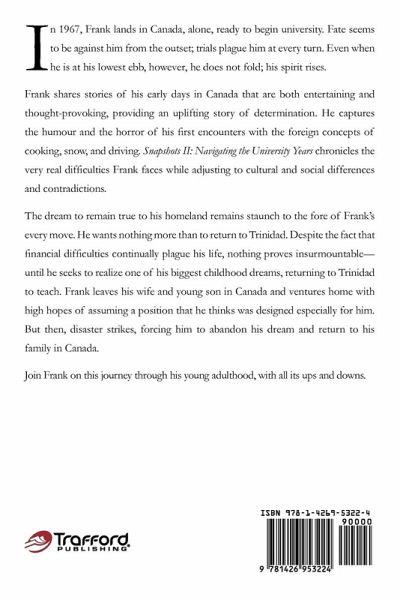 In 1967, Frank lands in Canada, alone, ready to begin university. Fate seems to be against him from the outset; trials plague him at every turn. Even when he is at his lowest ebb, however, he does not fold; his spirit rises. Frank shares stories of his early days in Canada that are both entertaining and thought-provoking, providing an uplifting story of determination. He captures the humour and the horror of his first encounters with the foreign concepts of cooking, snow, and driving. Snapshots II: Navigating the University Years chronicles the very real difficulties Frank faces while adjusting to cultural and social differences and contradictions. The dream to remain true to his homeland remains staunch to the fore of Frank's every move. He wants nothing more than to return to Trinidad. Despite the fact that financial difficulties continually plague his life, nothing proves insurmountable-until he seeks to realize one of his biggest childhood dreams, returning to Trinidad to teach. Frank leaves his wife and young son in Canada and ventures home with high hopes of assuming a position that he thinks was designed especially for him. But then, disaster strikes, forcing him to abandon his dream and return to his family in Canada. Join Frank on this journey through his young adulthood, with all its ups and downs.