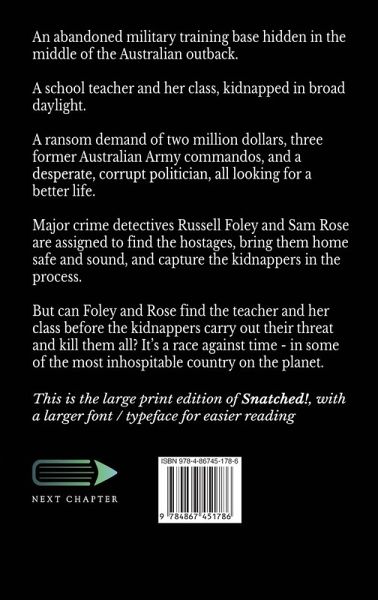 An abandoned military training base hidden in the middle of the Australian outback. A school teacher and her class, kidnapped in broad daylight. A ransom demand of two million dollars, three former Australian Army commandos, and a desperate, corrupt politician, all looking for a better life. Major crime detectives Russell Foley and Sam Rose are assigned to find the hostages, bring them home safe and sound, and capture the kidnappers in the process. But can Foley and Rose find the teacher and her class before the kidnappers carry out their threat and kill them all? It's a race against time - in some of the most inhospitable country on the planet. This is the large print edition of Snatched!, with a larger font / typeface for easier reading.