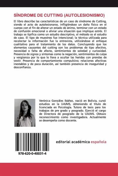 El libro describe las características de un caso de síndrome de Cutting, siendo el acto de autolesionarse, infligiéndose un daño físico en el cuerpo con el fin de alterar un estado de ánimo, terminar con un estado de confusión emocional o aliviar una situación que implique estrés. El trabajo se tipifica como un estudio descriptivo, el método es el estudio de caso. El tipo de muestreo fue intencional; la técnica utilizada para recolectar la información fue la entrevista, utilizándose el enfoque cualitativo para el tratamiento de los datos. Concluyendo que los elementos causantes del cutting son los problemas de tipo afectivo, necesidad o falta de afecto, sentimientos de soledad y curiosidad. Presencia de signos y síntomas como la negación, sentimientos de culpa y vergüenza por lo que le lleva a ocultar las heridas con prendas de vestir. Presencia de comportamiento compulsivo; relaciones afectivas inestables y de poca duración, así también presencia de inseguridad y desconfianza.
