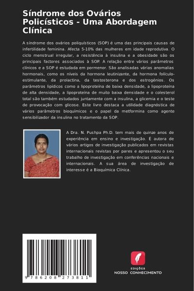 A síndrome dos ovários poliquísticos (SOP) é uma das principais causas de infertilidade feminina. Afecta 5-10% das mulheres em idade reprodutiva. O ciclo menstrual irregular, a resistência à insulina e a obesidade são os principais factores associados à SOP. A relação entre vários parâmetros clínicos e a SOP é estudada em pormenor. São analisadas várias anomalias hormonais, como os níveis da hormona leutinizante, da hormona folículo-estimulante, da prolactina, da testosterona e dos estrogénios. Os parâmetros lipídicos como a lipoproteína de baixa densidade, a lipoproteína de alta densidade, a lipoproteína de muito baixa densidade e o colesterol total são também estudados juntamente com a insulina, a glicemia e o teste de provocação com glicose. Este livro destaca a utilidade diagnóstica de vários parâmetros bioquímicos e o papel da metformina como agente sensibilizador da insulina no tratamento da SOP.