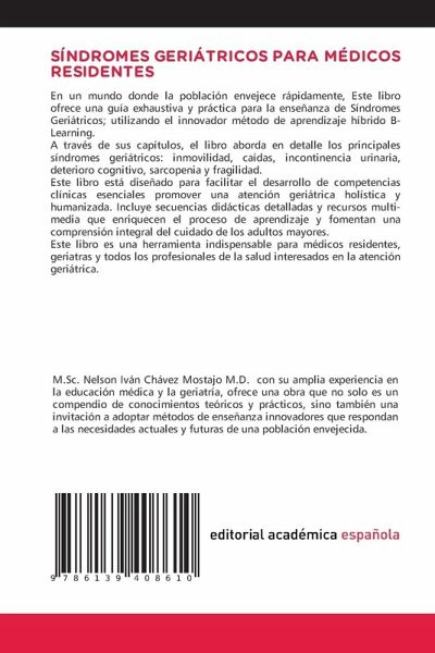 En un mundo donde la población envejece rápidamente, Este libro ofrece una guía exhaustiva y práctica para la enseñanza de Síndromes Geriátricos; utilizando el innovador método de aprendizaje híbrido B-Learning.A través de sus capítulos, el libro aborda en detalle los principales síndromes geriátricos: inmovilidad, caídas, incontinencia urinaria, deterioro cognitivo, sarcopenia y fragilidad. Este libro está diseñado para facilitar el desarrollo de competencias clínicas esenciales promover una atención geriátrica holística y humanizada. Incluye secuencias didácticas detalladas y recursos multi-media que enriquecen el proceso de aprendizaje y fomentan una comprensión integral del cuidado de los adultos mayores.Este libro es una herramienta indispensable para médicos residentes, geriatras y todos los profesionales de la salud interesados en la atención geriátrica.