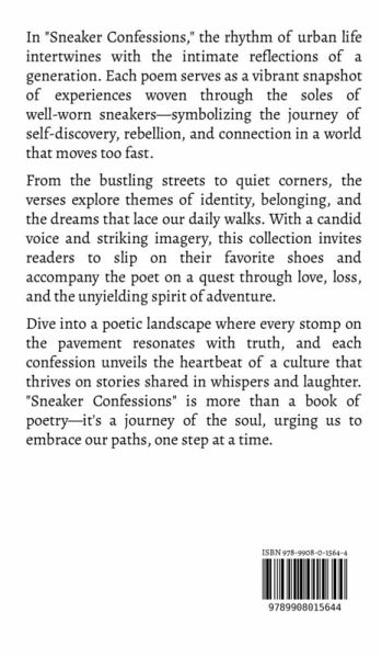 In "Sneaker Confessions," the rhythm of urban life intertwines with the intimate reflections of a generation. Each poem serves as a vibrant snapshot of experiences woven through the soles of well-worn sneakers-symbolizing the journey of self-discovery, rebellion, and connection in a world that moves too fast. From the bustling streets to quiet corners, the verses explore themes of identity, belonging, and the dreams that lace our daily walks. With a candid voice and striking imagery, this collection invites readers to slip on their favorite shoes and accompany the poet on a quest through love, loss, and the unyielding spirit of adventure. Dive into a poetic landscape where every stomp on the pavement resonates with truth, and each confession unveils the heartbeat of a culture that thrives on stories shared in whispers and laughter. "Sneaker Confessions" is more than a book of poetry-it's a journey of the soul, urging us to embrace our paths, one step at a time.