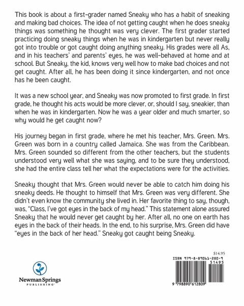 This book is about a first-grader named Sneaky who has a habit of sneaking and making bad choices. The idea of not getting caught when he does sneaky things was something he thought was very clever. The first grader started practicing doing sneaky things when he was in kindergarten but never really got into trouble or got caught doing anything sneaky. His grades were all As, and in his teachers' and parents' eyes, he was well-behaved at home and at school. But Sneaky, the kid, knows very well how to make bad choices and not get caught. After all, he has been doing it since kindergarten, and not once has he been caught. It was a new school year, and Sneaky was now promoted to first grade. In first grade, he thought his acts would be more clever, or, should I say, sneakier, than when he was in kindergarten. Now he was a year older and much smarter, so why would he get caught now? His journey began in first grade, where he met his teacher, Mrs. Green. Mrs. Green was born in a country called Jamaica. She was from the Caribbean. Mrs. Green sounded so different from the other teachers, but the students understood very well what she was saying, and to be sure they understood, she had the entire class tell her what the expectations were for the activities. Sneaky thought that Mrs. Green would never be able to catch him doing his sneaky deeds. He thought to himself that Mrs. Green was very different. She didn't even know the community she lived in. Her favorite thing to say, though, was, "Class, I've got eyes in the back of my head." This statement alone assured Sneaky that he would never get caught by her. After all, no one on earth has eyes in the back of their heads. In the end, to his surprise, Mrs. Green did have "eyes in the back of her head." Sneaky got caught being Sneaky.