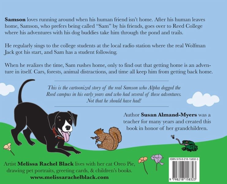 Susan Almand-Myers is a retired Language Arts teacher of 35 years who writes this story about her first lab mix Samson.She has written alongside her many students and wanted to see this piece brought to life. Fortunately, Susan and her sister ran into Melissa Rachel Black at the Rhodedenron Gardens and found out that Melissa draws beautifully, and her illustrations illuminate this fun story.Susan has a B.S. from Portland State University and a M.A.T. from Lewis and Clark College. She has three sons and daughter-in-law, husband Stan, and two wonderful granddaughters.
