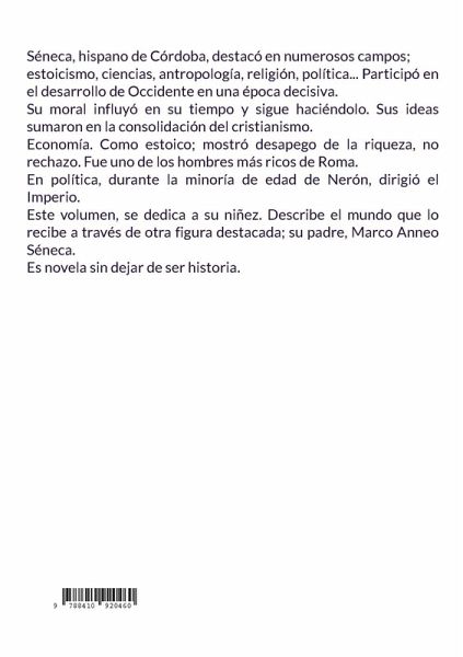 Séneca, hispano de Córdoba, destacó en numerosos campos; estoicismo, ciencias, antropología, religión, política... Participó en el desarrollo de Occidente en una época decisiva. Su moral influyó en su tiempo y sigue haciéndolo. Sus ideas sumaron en la consolidación del cristianismo. Economía. Como estoico; mostró desapego de la riqueza, no rechazo. Fue uno de los hombres más ricos de Roma. En política, durante la minoría de edad de Nerón, dirigió el Imperio. Este volumen, se dedica a su niñez. Describe el mundo que lo recibe a través de otra figura destacada; su padre, Marco Anneo Séneca. Es novela sin dejar de ser historia.