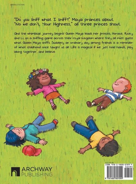 "Do you sniff what I sniff?" Maya prances about. "No we don’t, Your Highness," all three princes shout. And the whimsical journey begins! Queen Maya leads her princes, Horace, Ricky and Li, on a sniffing game across their royal kingdom where they all must guess what Queen Maya sniffs. Suddenly an ordinary day among friends is a reminder of what childhood once taught us all: Life is magical if we just hold hands, play along together, and believe.
