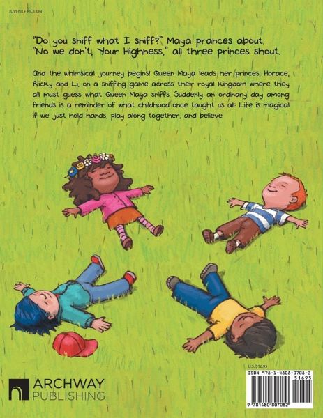 "Do you sniff what I sniff?" Maya prances about. "No we don't, Your Highness," all three princes shout. And the whimsical journey begins! Queen Maya leads her princes, Horace, Ricky and Li, on a sniffing game across their royal kingdom where they all must guess what Queen Maya sniffs. Suddenly an ordinary day among friends is a reminder of what childhood once taught us all: Life is magical if we just hold hands, play along together, and believe.