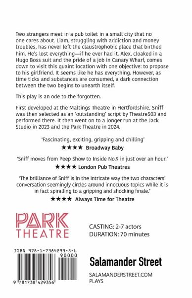 A dark, funny ode to the forgotten. Sniff is the story of two strangers who meet in a pub toilet that no one cares about. Are they killing time or drawn together through some dark drug and gambling-fuelled connection?