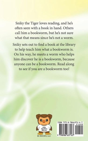 Sniky the Tiger loves reading, and he's often seen with a book in hand. Others call him a bookworm, but he's not sure what that means since he's not a worm. Sniky sets out to find a book at the library to help teach him what a bookworm is. On his way, he meets a friendly worm who helps him discover he is a bookworm, because anyone can be a bookworm. Read along to see if you are a bookworm too!