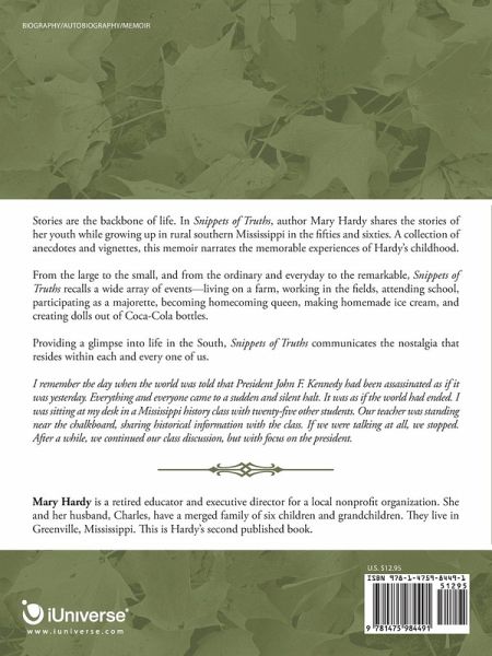 Stories are the backbone of life. In Snippets of Truths, author Mary Hardy shares the stories of her youth while growing up in rural southern Mississippi in the fifties and sixties. A collection of anecdotes and vignettes, this memoir narrates the memorable experiences of Hardy's childhood. From the large to the small, and from the ordinary and everyday to the remarkable, Snippets of Truths recalls a wide array of events-living on a farm, working in the fields, attending school, participating as a majorette, becoming homecoming queen, making homemade ice cream, and creating dolls out of Coca Cola bottles. Providing a glimpse into life in the South, Snippets of Truths communicates the nostalgia that resides within each and every one of us. I remember the day when the world was told that President John F. Kennedy had been assassinated as if it was yesterday. Everything and everyone came to a sudden and silent halt. It was as if the world had ended. I was sitting at my desk in a Mississippi history class with twenty-five other students. Our teacher was standing near the chalkboard, sharing historical information with the class. If we were talking at all, we stopped. After a while, we continued our class discussion, but with focus on the president.
