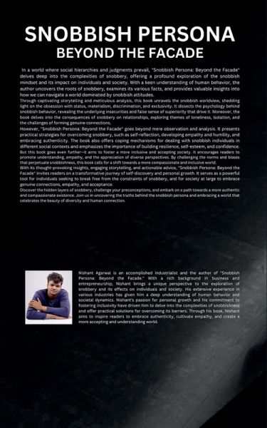 In ""Snobbish Persona: Beyond the Facade,"" delve into the intricate world of snobbery and uncover its hidden layers. This thought-provoking book explores the concept of snobbery, dissecting its origins, characteristics, and the impact it has on individuals and society. From the obsession with status and materialism to the condescending attitudes and exclusivity, the author sheds light on the complex nature of snobbish behavior. But this book goes beyond mere analysis. It offers practical insights and guidance on overcoming snobbish tendencies, fostering empathy, and embracing authenticity. Discover coping strategies for navigating a snobbish world, building resilience, and promoting inclusivity. With engaging anecdotes, psychological analysis, and thought-provoking perspectives, ""Snobbish Persona: Beyond the Facade"" challenges societal norms and encourages readers to question their own biases. It serves as a compass for personal growth, inspiring readers to break free from the confines of snobbery and forge meaningful connections based on genuine acceptance and understanding.