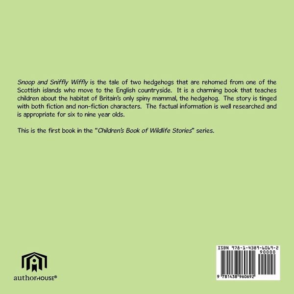 SNOOP AND SNIFFLY WIFFLY - THE TALE OF TWO HEDGEHOGS Snoop and Sniffly Wiffly is the tale of two hedgehogs that are rehomed from one of the Scottish islands who move to the English countryside. It is a charming book that teaches children about the habitat of Britain's only spiny mammal, the hedgehog. The story is tinged with both fiction and non-fiction characters. The factual information is well researched and is appropriate for six to nine year-olds. This is the first book in the "Children's Book of Wildlife Stories" series.