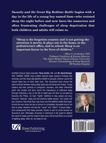 Snoozby and the Great Big Bedtime Battle begins with a day in the life of a young boy named Sam-who resisted sleep the night before and now faces the numerous and often frustrating challenges of sleep deprivation that both children and adults will relate to. Certified Clinical Sleep Educator Terry Cralle, RN, and W. David Brown, PhD, DABSM, CBSM, have crafted relevant sleep research findings into Snoozby and the Great Big Bedtime Battle to educate children about the impact sleep has on their daily lives. Fully aware of the stressful bedtime battles that play out in homes around the globe every night, the authors raise awareness of the benefits of sleep while "disarming" children who are fighting sleep. In turn, sufficient sleep becomes a "win-win" proposition for everyone. This illustrated book shows the stark contrast between being sleep deprived and being well rested. Young readers and their parents or caregivers, teachers, and other influential adult role models will learn about the importance of sufficient sleep through following a day in the life of eight-year-old Sam as narrated by Snoozby the Pillow. As Sam "fights" bedtime to stay awake and play, Snoozby "defends" sleep and the bedtime battle ensues. The reader will see, however, that while Sam may have won the bedtime battle that night, he lost the war when his day at school is completely disrupted due to his lack of sleep. Readers will see the "cause" and "effect" of good sleep-and subsequently that sleep prevails, thanks in part to some heroics on Snoozby's part. Ultimately, Snoozby is victorious in his quest to defend the need for sleep and the reader's take away will be that there is no point in fighting sleep. After all, we sleep to win.