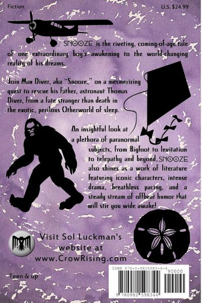 From acclaimed author Sol Luckman comes SNOOZE, the riveting, coming-of-age tale of one extraordinary boy's awakening to the world-changing reality of his dreams, winner of the 2015 National Indie Excellence Award for New Age Fiction. Join Max Diver, aka "Snooze," along the razor's edge of a quest to rescue his astronaut father from a fate stranger than death in the exotic, perilous Otherworld of sleep. An insightful look at a plethora of paranormal subjects, from Bigfoot and lucid dreaming to time travel via the Bermuda Triangle, SNOOZE also shines as a work of literature featuring iconic characters, intense drama and breathless pacing to stir you wide awake! Written with young adult and young-at-heart readers in mind, SNOOZE further proved its literary merit by being selected as a 2016 Readers' Favorite International Book Award Finalist in the Young Adult-Coming of Age category and receiving an Honorable Mention in the 2014 Beach Book Festival Prize competition in the General Fiction category.