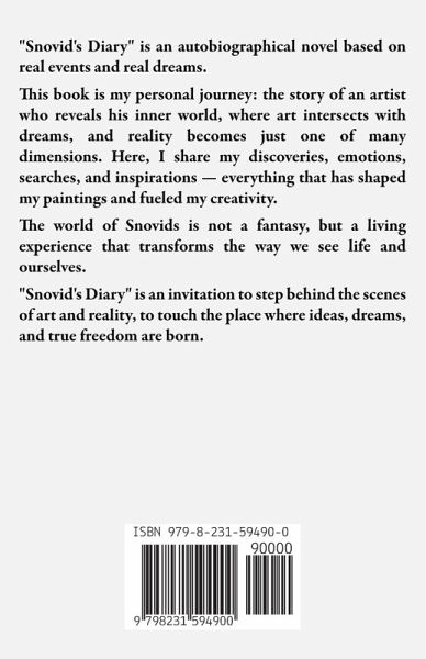 "Snovid's Diary" is an autobiographical novel based on real events and real dreams. This book is my personal journey: the story of an artist who reveals his inner world, where art intersects with dreams, and reality becomes just one of many dimensions. Here, I share my discoveries, emotions, searches, and inspirations - everything that has shaped my paintings and fueled my creativity. The world of Snovids is not a fantasy, but a living experience that transforms the way we see life and ourselves. "Snovid's Diary" is an invitation to step behind the scenes of art and reality, to touch the place where ideas, dreams, and true freedom are born.