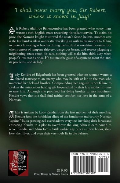 Sir Robert Alain de Bellencombre has been granted what every man wants: a rich English estate in exchange for his valiant service at the Battle of Hastings. To claim this reward, the Norman knight must wed the estate's Saxon heiress. Most men would leap at such an opportunity, but for Alain, who broke his vow to his dying mother by failing to protect his youngest brother in battle, it means facing more easily broken vows. But when rumors of rampant thievery, dangerous beasts, and sorcery plaguing a neighboring estate reach his ears, nothing will make him shirk duty to king and country when people's lives stand at risk. He assumes the guise of a squire to scout the land, its problems, and its lady. Lady Kendra of Edgarburh has been granted what no woman wants: a forced marriage to an enemy who may be kith or kin to the man who murdered her beloved brother. Compounding her anguish is her failure to awaken the miraculous healing gift bequeathed by their late mother in time to save his life. Although with his dying breath, he made her promise to seek happiness above all, Kendra vows that she shall find neither comfort nor love in the arms of a Norman...unless it snows in July. Alain is smitten by Lady Kendra from the first moment of their meeting; Kendra feels the forbidden allure of the handsome and courtly Norman "squire." But a growing evil overshadows everyone, invoking dark forces and ensnaring Kendra in a plot to overthrow the king Alain is oath-bound to serve. Kendra and Alain face a battle unlike any other as their honor, their love, their lives, and even their very souls lie in the balance.