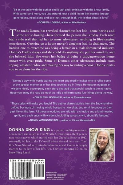 DONNA SNOW KING is a proud, multi-generational Texan, born and raised in Fort Worth. Growing up a third generation house mover, which started with her Grandpa Snow in 1942, eventually led her to the TV world where she and her sister, Toni, (The Snow Sisters) were introduced to the world. Donna is happily married to the love of her life, Rex. They are enjoying life on the Snow King Ranch. The roads Donna has traveled throughout her life - some boring and some not so boring - have formed the person she is today. Each road had a side trail that led her to many adventures, resulting in life-changing experiences. Growing up a house mover's daughter had its challenges. The hardest one to overcome was being a female in a male-dominated industry. Donna's Daddy always said she could do anything she put her mind to, and she believed him. She wears her badge of being a third-generation house mover with great pride. Some of Donna's other adventures include team roping, amateur radio, and making her way to writing a book. Donna invites you to go along for the ride as she shares experiences through her short stories and lessons learned.