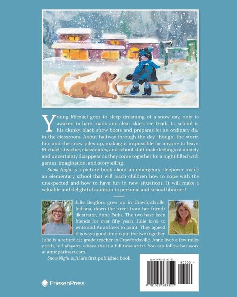 Young Michael goes to sleep dreaming of a snow day, only to awaken to bare roads and clear skies. He heads to school in his clunky, black snow boots and prepares for an ordinary day in the classroom. About halfway through the day, though, the storm hits and the snow piles up, making it impossible for anyone to leave. Michael's teacher, classmates, and school staff make feelings of anxiety and uncertainty disappear as they come together for a night filled with games, imagination, and storytelling. Snow Night is a picture book about an emergency sleepover inside an elementary school that will teach children how to cope with the unexpected and how to have fun in new situations. It will make a valuable and delightful addition to personal and school libraries!