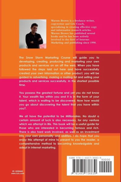The Snow Storm Marketing Course will guide you to developing, creating, producing and marketing your own products and services on an off the web. When you have followed the steps laid out here and have successfully created your own information or other product, you will be guided to advertising, making a mailing list and selling your products and services successfully, in the shortest possible time.