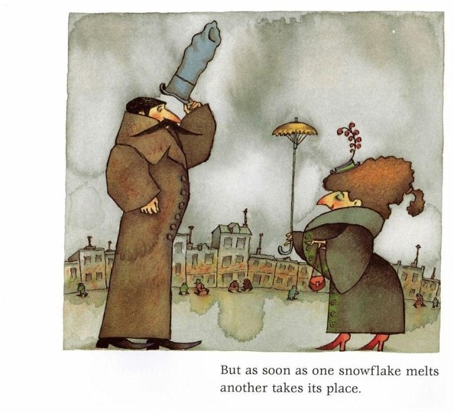 Snow is a 1998 New York Times Outstanding Book of the Year and a 1999 Caldecott Honor Book. "It's snowing, said boy with dog. "It's only a snowflake," said grandfather with beard. No one thinks one or two snowflakes will amount to anything. Not the man with the hat or the lady with the umbrella. Not even the television or the radio forecasters. But one boy and his dog have faith that the snow will amount to something spectacular, and when flakes start to swirl down on the city, they are also the only ones who know how to truly enjoy it. Uri Shulevitz' playful depiction of a snowy day and the transformation of a city is perfectly captured in simple, poetic text and lively watercolor and pen-and-ink illustrations.