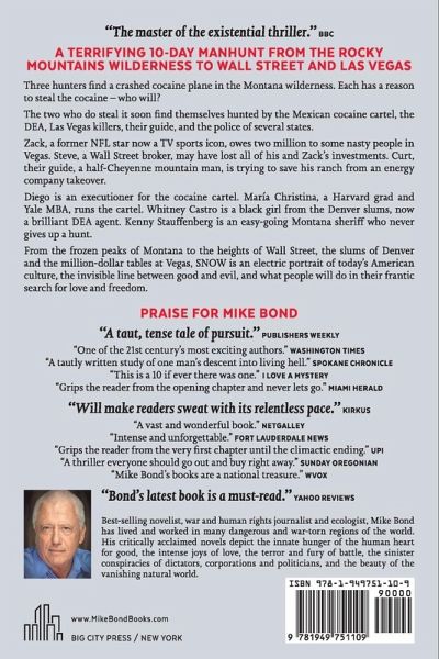 Two hunters and their guide find a crashed cocaine plane in the Montana wilderness. Each has a reason to steal the cocaine - who will? The two who do steal it soon find themselves hunted by the Mexican cocaine cartel, the DEA, Las Vegas killers, their guide, and the police of several states. Zack, a former NFL star now a TV sports icon, owes two million to some nasty people in Vegas. Steve, a Wall Street broker, may have lost all of his and Zack's investments. Curt, their guide, a half-Cheyenne mountain man, is trying to save his ranch from an energy company takeover. Diego is an executioner for the cocaine cartel. María Christina, a Harvard grad and Yale MBA, runs the cartel. Whitney Castro is a black girl from the Denver slums, now a brilliant DEA agent. Kenny Stauffenberg is an easy-going Montana sheriff who never gives up a hunt. From the frozen peaks of Montana to the heights of Wall Street, the slums of Denver and the million-dollar tables at Vegas, SNOW is an electric portrait of today's American culture, the invisible line between good and evil, and what people will do in their frantic search for love and freedom.