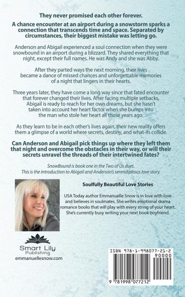 Stranded in a snowstorm, their connection was instant, and they shared everything that night, except their full names. Three years later, as secrets need to be revealed, can they trust the universe to put them on the same path once again? SnowBound is an highly emotional love story perfect for fans of Jennifer Hartmann, Paige Toon, Rebecca Yarros, and Mia Sheridan. All Anderson Ford has ever wanted is to pursue a music career, but after a deal with his mother, he must finish college first. Abigail Peña is ready to take Nashville's music scene by storm, halfway through her degree in music management and eager to leave her mark on the industry. Fate intertwines their paths, united by a shared love for music. A chance encounter at an airport during a snowstorm sparks a connection that transcends time and space. They share everything that night, except their full names. Separated by circumstances, they soon realize their biggest mistake was letting go. Their lives become a dance of missed chances and unforgettable memories of a night that lingers in their hearts. As Anderson and Abigail try to move forward, one question remains: Is the universe conspiring to keep them apart? Years later, as they navigate life's complexities, their paths converge once more, offering a glimpse of a world where destiny, memories, and what-ifs collide. Will they overcome the obstacles in their way, or will their secrets unravel the threads of their intertwined fates? SnowBound is a heartfelt tale of love, serendipity, and resilience that will immerse you in the enduring power of love until the last page.This is book one in the Two of Us duet. This is the introduction to Abigail and Anderson's serendipitous love story.