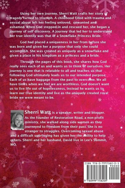 Using her own journey, the author crafts her story of a childhood filled with trauma and sexual abuse, feeling unloved, unwanted, and ashamed. She shares how God really sees everyone and wants them to learn their true identity as a Snowflake Princess Bride, a uniquely created royal bride loved by God, the creator of all things.