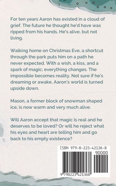 A second change gay holiday romance, with a touch of magic. Reviwers say: Magical, sweet romance. Only a short read but worth every penny, it's packed with two wonderful characters, snow and takes place at a magical time of year. It's steamy m/m, second chance love for Aaron. I loved it, didn't come up for air for the time I was reading it and finished it believing in wishes coming true. Absolute romance. -Wendy H. For ten years Aaron has existed in a cloud of grief. The future he thought he'd have was ripped from his hands. He's alive, but not living. Walking home on Christmas Eve, a shortcut through the park puts him on a path he never expected. With a wish, a kiss, and a spark of magic; everything changes. The impossible becomes reality. Not sure if he's dreaming or awake, Aaron's world is turned upside down. Mason, a former block of snowman shaped ice, is now warm and very much alive. Will Aaron accept that magic is real and he deserves to be loved? Or will he reject what his eyes and heart are telling him and go back to his empty existence?