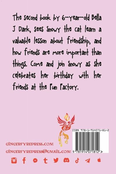 The second book by 6-year-old Bella J Dark, sees Snowy learn a valuable lesson about friendship, and how friends are more important than things. Come and join Snowy as she celebrates her birthday at the Fun Factory.