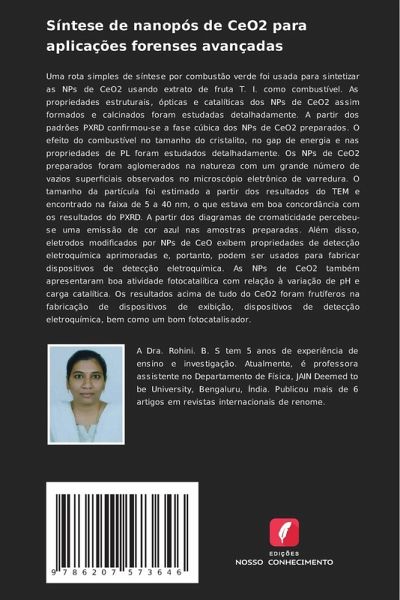 Uma rota simples de síntese por combustão verde foi usada para sintetizar as NPs de CeO2 usando extrato de fruta T. I. como combustível. As propriedades estruturais, ópticas e catalíticas dos NPs de CeO2 assim formados e calcinados foram estudadas detalhadamente. A partir dos padrões PXRD confirmou-se a fase cúbica dos NPs de CeO2 preparados. O efeito do combustível no tamanho do cristalito, no gap de energia e nas propriedades de PL foram estudados detalhadamente. Os NPs de CeO2 preparados foram aglomerados na natureza com um grande número de vazios superficiais observados no microscópio eletrônico de varredura. O tamanho da partícula foi estimado a partir dos resultados do TEM e encontrado na faixa de 5 a 40 nm, o que estava em boa concordância com os resultados do PXRD. A partir dos diagramas de cromaticidade percebeu-se uma emissão de cor azul nas amostras preparadas. Além disso, eletrodos modificados por NPs de CeO exibem propriedades de detecção eletroquímica aprimoradas e, portanto, podem ser usados ¿¿para fabricar dispositivos de detecção eletroquímica. As NPs de CeO2 também apresentaram boa atividade fotocatalítica com relação à variação de pH e carga catalítica. Os resultados acima de tudo do CeO2 foram frutíferos na fabricação de dispositivos de exibição, dispositivos de detecção eletroquímica, bem como um bom fotocatalisador.