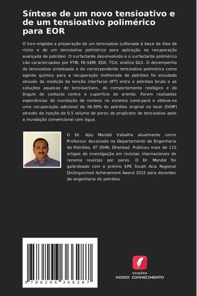 O livro engloba a preparação de um tensioativo sulfonado à base de óleo de rícino e de um tensioativo polimérico para aplicação na recuperação avançada de petróleo. O surfactante desenvolvido e o surfactante polimérico são caracterizados por FTIR, FE-SEM, EDX, TGA, análise DLS. O desempenho do tensioativo sintetizado e do correspondente tensioativo polimérico como agente químico para a recuperação melhorada de petróleo foi estudado através da medição da tensão interfacial (IFT) entre o petróleo bruto e as soluções aquosas de tensioactivos, do comportamento reológico e do ângulo de contacto contra a superfície do arenito. Foram realizadas experiências de inundação de núcleos no sistema sand-pack e obteve-se uma recuperação adicional de 26-30% do petróleo original no local (OOIP) através da injeção de 0,5 volume de poros de projécteis de tensioativo após a inundação convencional com água.