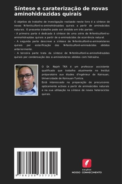 O objetivo do trabalho de investigação realizado neste livro é a síntese de novas N-fenilsulfonil-¿-aminohidrazidas quirais a partir de aminoácidos naturais. O presente trabalho pode ser dividido em três partes:- A primeira parte é dedicada à síntese de uma série de N-fenilsulfonil-¿-aminohidrazidas quirais a partir de ¿-aminoácidos de ocorrência natural.- A segunda parte descreve a síntese de N-fenilsulfonil-¿-aminoésteres quirais por esterificação dos N-fenilsulfonil-aminoácidos obtidos anteriormente.- A terceira parte trata da síntese de N-fenilsulfonil-¿-aminohidrazidas quirais por condensação dos ¿-aminoésteres obtidos com hidrazina.