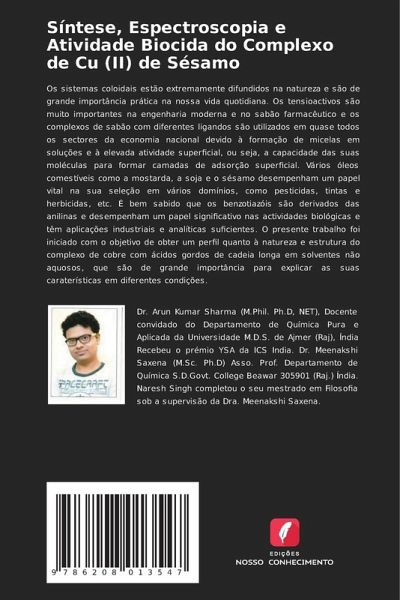 Os sistemas coloidais estão extremamente difundidos na natureza e são de grande importância prática na nossa vida quotidiana. Os tensioactivos são muito importantes na engenharia moderna e no sabão farmacêutico e os complexos de sabão com diferentes ligandos são utilizados em quase todos os sectores da economia nacional devido à formação de micelas em soluções e à elevada atividade superficial, ou seja, a capacidade das suas moléculas para formar camadas de adsorção superficial. Vários óleos comestíveis como a mostarda, a soja e o sésamo desempenham um papel vital na sua seleção em vários domínios, como pesticidas, tintas e herbicidas, etc. É bem sabido que os benzotiazóis são derivados das anilinas e desempenham um papel significativo nas actividades biológicas e têm aplicações industriais e analíticas suficientes. O presente trabalho foi iniciado com o objetivo de obter um perfil quanto à natureza e estrutura do complexo de cobre com ácidos gordos de cadeia longa em solventes não aquosos, que são de grande importância para explicar as suas caraterísticas em diferentes condições.