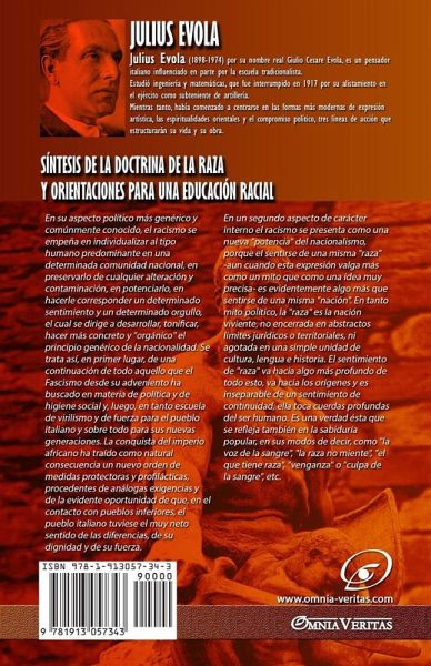 En su aspecto político más genérico y comúnmente conocido, el racismo se empeña en individualizar al tipo humano predominante en una determinada comunidad nacional, en preservarlo de cualquier alteración y contaminación, en potenciarlo, en hacerle corresponder un determinado sentimiento y un determinado orgullo, el cual se dirige a desarrollar, tonificar, hacer más concreto y "orgánico" el principio genérico de la nacionalidad. Se trata así, en primer lugar, de una continuación de todo aquello que el Fascismo desde su adveniento ha buscado en materia de política y de higiene social y, luego, en tanto escuela de virilismo y de fuerza para el pueblo italiano y sobre todo para sus nuevas generaciones. La conquista del imperio africano ha traído como natural consecuencia un nuevo orden de medidas protectoras y profilácticas, procedentes de análogas exigencias y de la evidente oportunidad de que, en el contacto con pueblos inferiores, el pueblo italiano tuviese el muy neto sentido de las diferencias, de su dignidad y de su fuerza. En un segundo aspecto de carácter interno el racismo se presenta como una nueva "potencia" del nacionalismo, porque el sentirse de una misma "raza" -aun cuando esta expresión valga más como un mito que como una idea muy precisa- es evidentemente algo más que sentirse de una misma "nación". En tanto mito político, la "raza" es la nación viviente, no encerrada en abstractos límites jurídicos o territoriales, ni agotada en una simple unidad de cultura, lengua e historia. El sentimiento de "raza" va hacia algo más profundo de todo esto, va hacia los orígenes y es inseparable de un sentimiento de continuidad, ella toca cuerdas profundas del ser humano. Es una verdad ésta que se refleja también en la sabiduría popular, en sus modos de decir, como "la voz de la sangre", "la raza no miente", "el que tiene raza", "venganza" o "culpa de la sangre", etc.