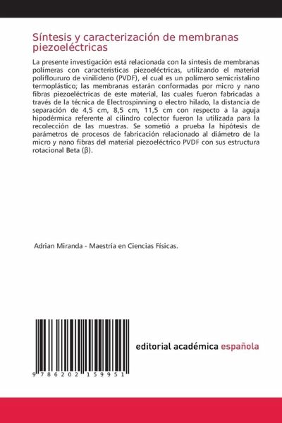 La presente investigación está relacionada con la síntesis de membranas polímeras con características piezoeléctricas, utilizando el material polifloururo de vinilideno (PVDF), el cual es un polímero semicristalino termoplástico; las membranas estarán conformadas por micro y nano fibras piezoeléctricas de este material, las cuales fueron fabricadas a través de la técnica de Electrospinning o electro hilado, la distancia de separación de 4,5 cm, 8,5 cm, 11,5 cm con respecto a la aguja hipodérmica referente al cilindro colector fueron la utilizada para la recolección de las muestras. Se sometió a prueba la hipótesis de parámetros de procesos de fabricación relacionado al diámetro de la micro y nano fibras del material piezoeléctrico PVDF con sus estructura rotacional Beta (ß).