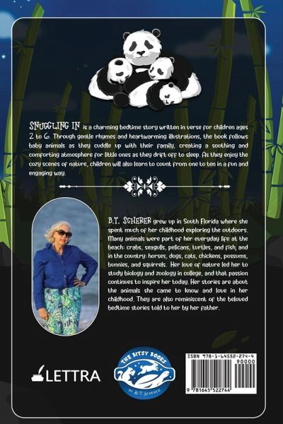 Snugglin In By B.T. Scherer Snuggling In is a charming bedtime story written in verse for children ages 2 to 6. Through gentle rhymes and heartwarming illustrations, the book follows baby animals as they cuddle up with their family, creating a soothing and comforting atmosphere for little ones as they drift off to sleep. As they enjoy the cozy scenes of nature, children will also learn to count from one to ten in a fun and engaging way. B.T. Scherer grew up in South Florida, where she spent much of her childhood exploring the outdoors. Many animals were part of her everyday life at the beach: crabs, seagulls, pelicans, turtles, and fish; and in the country: horses, dogs, cats, chickens, possums, bunnies, and squirrels. Her love of nature led her to study biology and zoology in college, and that passion continues to inspire her today. Her stories are about the animals she came to know and love in her childhood. They are also reminiscent of the beloved bedtime stories told to her by her father.