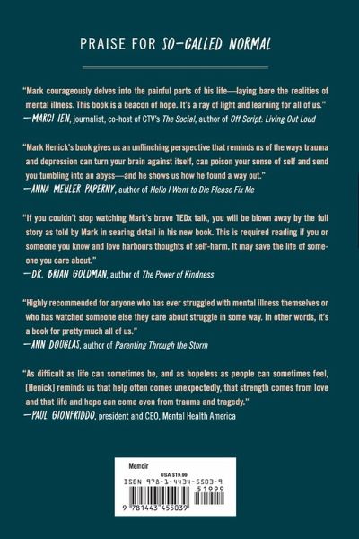 ?Mark Henick is a powerful storyteller.? ?Rosie O'Donnell ?So-Called Normal is a call to arms, yes, but it's also a call to care, highlighting the power of kindness. Required reading for anyone working with children and teens.? ?The Globe and Mail????? A vital and triumphant story of perseverance and recovery by one of Canada's foremost advocates for mental health When Mark Henick was a teenager in Cape Breton, Nova Scotia, he was overwhelmed by depression and anxiety that led to a series of increasingly dangerous suicide attempts. One night, he climbed onto a bridge over an overpass and stood in the wind, clinging to a girder. Someone shouted, ?Jump, you coward!? Another man, a stranger in a brown coat, talked to him quietly, calmly and with deep empathy. Just as Henick's feet touched open air, the man in the brown coat encircled his chest and pulled him to safety. This near-death experience changed Henick's life forever. So-Called Normal is Henick's memoir about growing up in a broken home and the events that led to that fateful night on the bridge. It is a vivid and personal account of the mental health challenges he experienced in childhood and his subsequent journey toward healing and recovery.