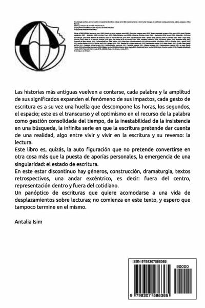 Las historias más antiguas vuelven a contarse, cada palabra y la amplitud de sus significados expanden el fenómeno de sus impactos, cada gesto de escritura es a su vez una huella que descompone las horas, los segundos, el espacio; este es el transcurso y el optimismo en el recurso de la palabra como gestión consolidada del tiempo, de la inestabilidad de la insistencia en una búsqueda, la infinita serie en que la escritura pretende dar cuenta de una realidad, algo entre vivir y vivir en la escritura y su reverso: la lectura. Este libro es, quizás, la auto figuración que no pretende convertirse en otra cosa más que la puesta de aporías personales, la emergencia de una singularidad: el estado de escritura. En este estar discontinuo hay géneros, construcción, dramaturgia, textos retrospectivos, una andar excéntrico, es decir: fuera del centro, representación dentro y fuera del cotidiano. >Antalia Isim.