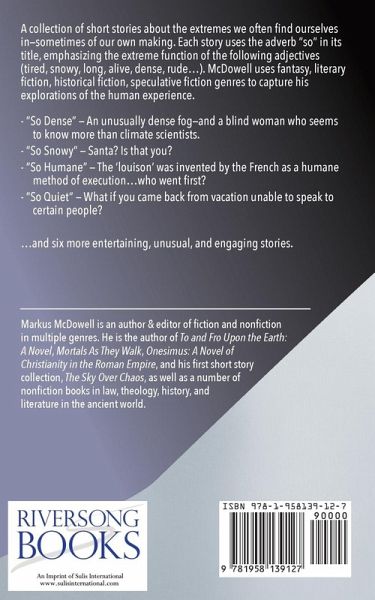 A collection of short stories about the extremes we often find ourselves in-sometimes of our own making. Each story uses the adverb "so" in its title, emphasizing the extreme function of the following adjectives (tired, snowy, long, alive, dense, rude...). McDowell uses fantasy, literary fiction, historical fiction, speculative fiction genres to capture his explorations of the human experience. "So Dense" - An unusually dense fog-and a blind woman who seems to know more than climate scientists. "So Snowy" - Santa? Is that you? "So Humane" - The 'louison' was invented by the French as a humane method of execution...who went first? "So Quiet" - What if you came back from vacation unable to speak to certain people? ...and six more unusual and engaging stories by Markus McDowell.