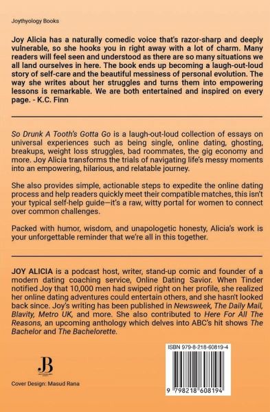 So Drunk A Tooth's Gotta Go is a laugh-out-loud collection of essays on universal experiences such as being single, online dating, ghosting, breakups, weight loss struggles, bad roommates, the gig economy and more. Joy Alicia transforms the trials of navigating life's messy moments into an empowering, hilarious, and relatable journey. This book challenges readers to rethink their relationships-romantic or otherwise-with toxic people, and embrace life's misadventures. So Drunk A Tooth's Gotta Go also provides simple, actionable steps to expedite the online dating process and help readers quickly meet their compatible matches. After more than 15 years of online dating experience and countless conversations with rideshare passengers, Alicia delivers practical advice for finding love (or at least a great story) faster and with fewer headaches. This isn't your typical self-help guide-it's a raw, witty portal for women to connect over common challenges. Through candid stories, So Drunk A Tooth's Gotta Go offers the powerful lesson that confidence is the best form of self-care. Readers say: "The beauty of these essays lies in the timelessness and universality of the stories as they unfold... What came through in this collection was the absolute need for all of us to have belief and trust in our own worth and not look for validation from others." Packed with humor, wisdom, and unapologetic honesty, So Drunk A Tooth's Gotta Go is your unforgettable reminder that we're all in this together.