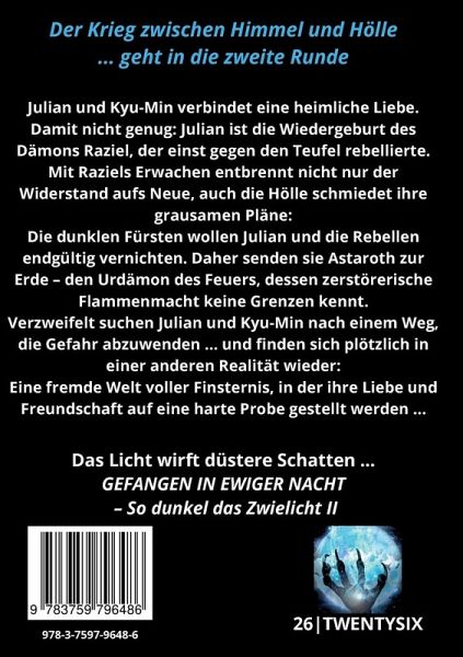 Der Krieg zwischen Himmel und Hölle ... geht in die zweite Runde. Julian und Kyu-Min verbindet eine heimliche Liebe. Damit nicht genug: Julian ist die Wiedergeburt des Dämons Raziel, der einst gegen den Teufel rebellierte. Mit Raziels Erwachen entbrennt nicht nur der Widerstand aufs Neue, auch die Hölle schmiedet ihre grausamen Pläne: Die dunklen Fürsten wollen Julian und die Rebellen endgültig vernichten. Daher senden sie Astaroth zur Erde - den Urdämon des Feuers, dessen zerstörerische Flammenmacht keine Grenzen kennt. Verzweifelt suchen Julian und Kyu-Min nach einem Weg, die Gefahr abzuwenden ... und finden sich plötzlich in einer anderen Realität wieder: Eine fremde Welt voller Finsternis, in der ihre Liebe und Freundschaft auf eine harte Probe gestellt werden ... Das Licht wirft düstere Schatten ... "Gefangen in ewiger Nacht - So dunkel das Zwielicht II"