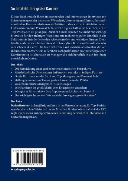 Dieses Buch erzählt Ihnen in spannenden und informativen Interviews mit Spitzenmanagern der deutschen Wirtschaft, Unternehmensführern, Personalvorständen, Konzerninhabern oder Politikern, aber auch mit mittelständischen Unternehmern und Personalchefs, welche Eigenschaften Sie brauchen, um in Top-Positionen zu gelangen. Darüber hinaus erhalten Sie nicht nur wichtige Hinweise für den richtigen Weg, sondern auch einen guten Einblick in das Selbstverständnis der leitenden Akteure großer und wichtiger Firmen. Denn häufig verbirgt sich hinter einer durchgestylten Business-Fassade ein sehr menschliches Gesicht. Das Buch richtet sich an Hochschulabsolventen, die sich informieren möchten, was außer ihrer Fachqualifikation zu einer erfolgreichen Karriere nötig ist, aber auch an Manager, die sich beruflich in die Top-Etage entwickeln möchten.