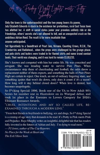 A 90's Friday Night Lights meets Fifty Shades... only the town is the sadomasochist and the two young lovers its pawns. July Elizabeth Edwards is stuck in the existence her pretentious, rural East Texas town has allotted her. A shift in social status junior year provokes unlikely ride or die friendships, others' secrets she's not allowed to tell, and an unexpected crush on the ambitious Adrian Reed. The result is far more insatiable than anyone anticipated. Before cell phones and social media, walk the halls of Pure Pines High as they are set figuratively to a Soundtrack of Pearl Jam, Nirvana, Counting Crows, R.E.M., The Cranberries and Radiohead... When the preps were challenged by the grunge phase, and polo shirts and loafers were traded in for flannel shirts and name brand combat boots. Their world was changing, and it was hard to remain CLUELESS. She's known and competed with him her entire life. He was conceited and arrogant. She was treading water to survive Pure Pines. When circumstances strip them of cheerleading and football, the odds throw a replacement neither of them expects, and something the halls of Pure Pines High are certain to reject. One touch, an out of ordinary lingering stare, and something ignites that won't die down, only does it count if it's a secret? How long will it stay behind closed doors? When love is denied, lust becomes unapologetic. So F*cking Special: 1996, Book one of the YA to New Adult 90's Series hit number one in #lusttolove on its Wattpad debut, and won first place in the Enemies to Lovers Category for 2024's Ultimate Romance Awards. "Cruel intentions and My so Called Life, re-examined through a modern lens."