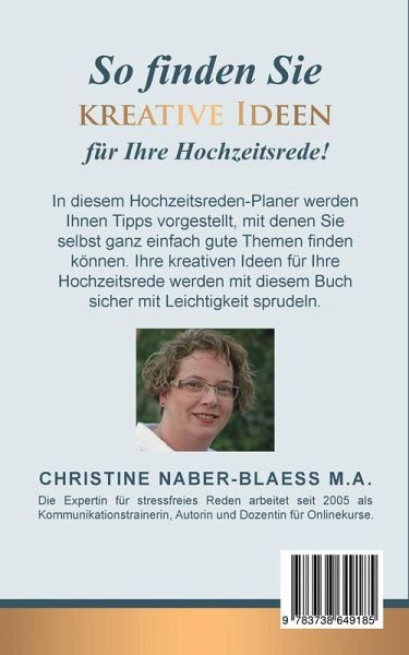 Sie müssen oder wollen eine Hochzeitsrede halten. Was nun? Man will ja nicht dumm dastehen und die Anwesenden langweilen, oder?In diesem Buch finden Sie die besten Tipps und Tricks um auf gute Ideen für Ihre Hochzeitsrede zu kommen. Kreativitäts-Mangel wird Ihnen mit diesem Buch keine Probleme mehr bereiten. Tauchen Sie jetzt in das Meer der Ideen, schreiben und halten Sie eine gelungene Hochzeitsrede, die zu Ihnen und dem Brautpaar passt.