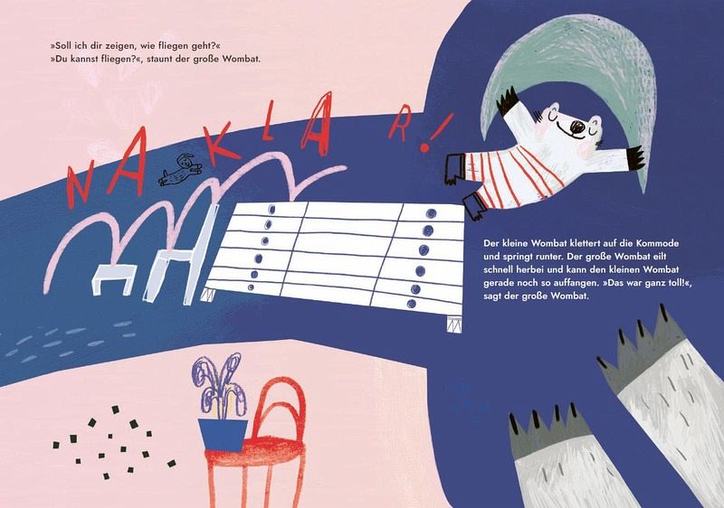 Der kleine Wombat soll schlafen gehen. Doch vor dem Einschlafen muss er seinem Papa erst noch zeigen, wie schnell er rennen, wie hoch er fliegen und was er noch so alles für super Sachen kann. Ob