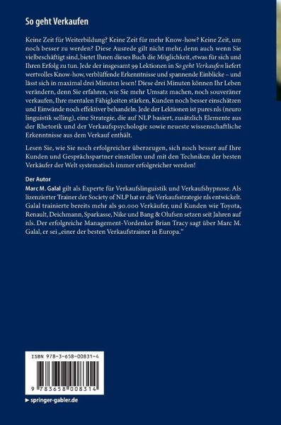 Keine Zeit für Weiterbildung? Keine Zeit für mehr Know-how? Keine Zeit, um noch besser zu werden? Diese Ausrede gilt nicht mehr, denn auch Vielbeschäftigten bietet dieses Buch die Möglichkeit, etwas für sich und ihren Erfolg zu tun. Jede der insgesamt 99 Lektionen in "So geht Verkaufen" liefert wertvolles Know-how, verblüffende Erkenntnisse und spannende Einblicke - und lässt sich in maximal drei Minuten lesen! Diese drei Minuten können das Leben verändern, denn hier wird beschrieben, wie es gelingt, mehr Umsatz zu machen, noch souveräner zu verkaufen, die mentalen Fähigkeiten zu stärken, Kunden noch besser einzuschätzen und Einwände noch effektiver zu behandeln. Jede der Lektionen ist pures nls (neuro linguistik selling), eine Strategie, die auf NLP basiert, zusätzlich Elemente aus der Rhetorik und der Verkaufspsychologie sowie neueste wissenschaftliche Erkenntnisse aus dem Verkauf enthält.